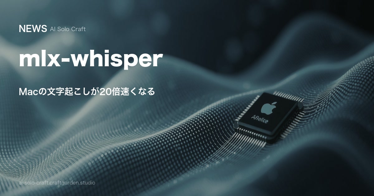 Apple Silicon Mac向けの文字起こしライブラリmlx-whisperを使えば、通常のWhisperより約20倍高速に音声認識できる。3分の動画を5.4秒で文字起こし。pip install mlx-whisperだけで導入可能。